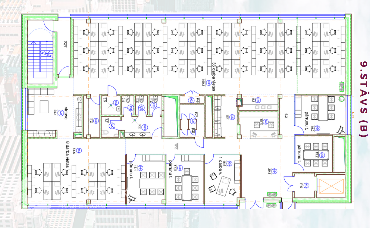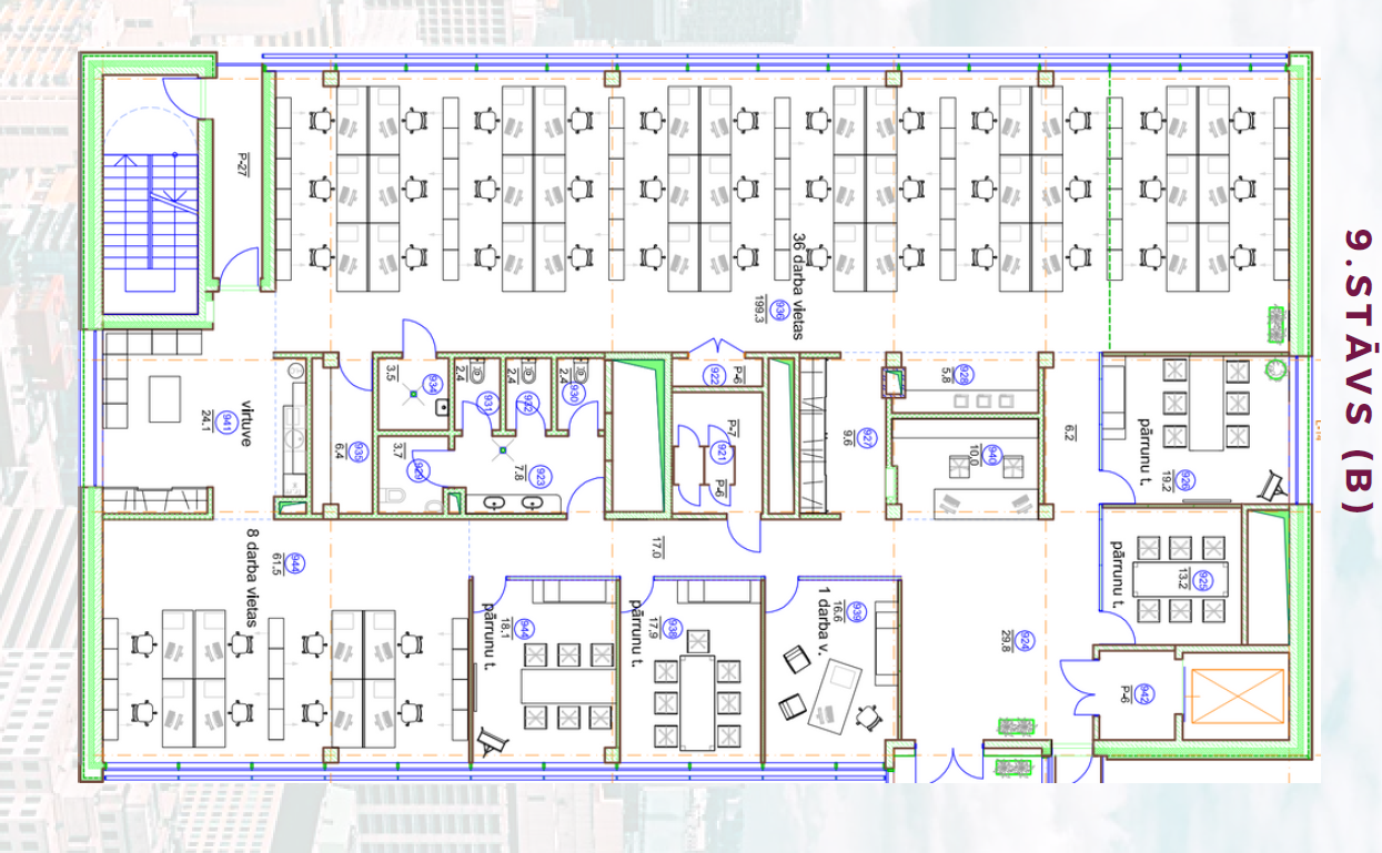 Biroja telpas izvietotas ēkas 2. un 3. stāvā - katrā stāvā 500 m2.